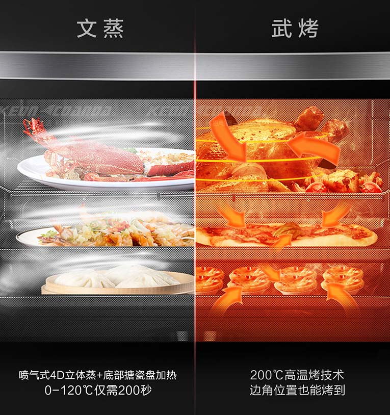 隨著蒸烤一體集成灶走進千家萬戶,消費者卻提出了更高的產品需求。為滿足更多消費者需求,科恩智能蒸烤消一體集成灶除了擁有蒸烤烹飪功能外,還具備了高溫消毒功能,完美突破了單一的烹飪需求。與此同時,科恩智能蒸烤消一體集成灶采用4D立體直噴蒸烤模式,四面受熱均勻,并有多重蒸烤模式選擇,廣域控溫設計,蒸箱加熱速度一提再提,熱風對流立體烘烤色香味俱全,即使多種美食同時烹飪也不串味!有了科恩智能蒸烤消一體集成灶就是有了廚房神器,讓生活更有品味!
