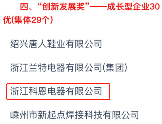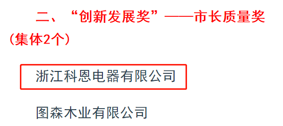 2021年2月10日,嵊州市人民政府發(fā)文公布2020年度嵊州市市長(zhǎng)質(zhì)量獎(jiǎng)。該獎(jiǎng)項(xiàng)由浙江科恩電器有限公司榮獲。獲得該獎(jiǎng)項(xiàng)意味著科恩電器有限公司的產(chǎn)品質(zhì)量取得了政府、專(zhuān)家的一致肯定,在行業(yè)內(nèi)樹(shù)起先進(jìn)的質(zhì)量標(biāo)桿形象。