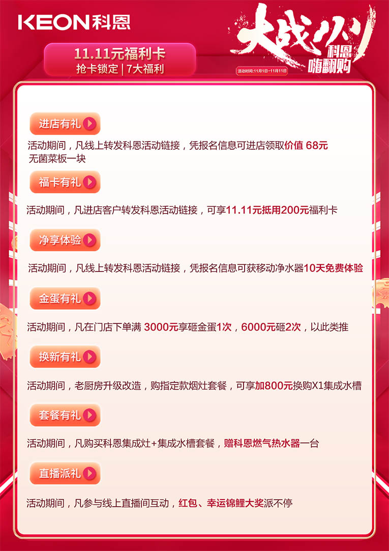 大戰(zhàn)雙11,科恩嗨翻購,11月1日——11月11日活動(dòng)期間,前往科恩全國門店提前搶購11.11元福利卡,就能提前鎖定7大福利。進(jìn)店有禮:活動(dòng)期間,凡線上轉(zhuǎn)發(fā)科恩活動(dòng)鏈接,憑報(bào)名信息可進(jìn)店領(lǐng)取價(jià)值68元無菌菜板一塊;福卡有禮:活動(dòng)期間,凡進(jìn)店客戶轉(zhuǎn)發(fā)科恩活動(dòng)鏈接,可享11.11元抵用200元福利卡;凈享體驗(yàn):活動(dòng)期間,凡線上轉(zhuǎn)發(fā)科恩活動(dòng)鏈接,憑報(bào)名信息可獲移動(dòng)凈水器10天免費(fèi)體驗(yàn);金蛋有禮:活動(dòng)期間,凡在門店下單滿3000元享砸金蛋1次,6000元砸2次,以此類推;換新有禮:活動(dòng)期間,老廚房升級(jí)改造,購指定款煙灶套餐,可享加800元換購X1集成水槽;套餐有禮:活動(dòng)期間,凡購買科恩集成灶+集成水槽套餐,贈(zèng)科恩燃?xì)鉄崴饕惶祝恢辈ヅ啥Y:活動(dòng)期間,凡參與線上直播間互動(dòng),紅包、幸運(yùn)錦鯉大獎(jiǎng)派不停。