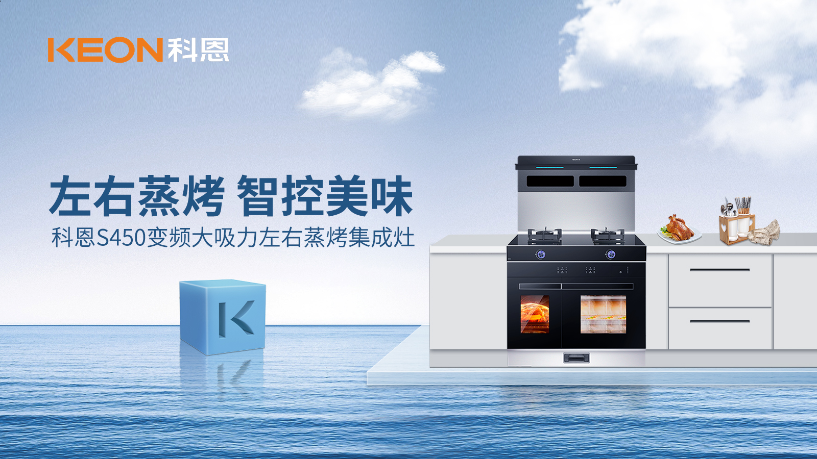 科恩S450左右蒸烤智能語音集成灶全面開啟左烤右蒸新時代,無論你是廚房大廚還是廚房小白,都能一鍵定制蒸烤美食,讓美食如約而至!