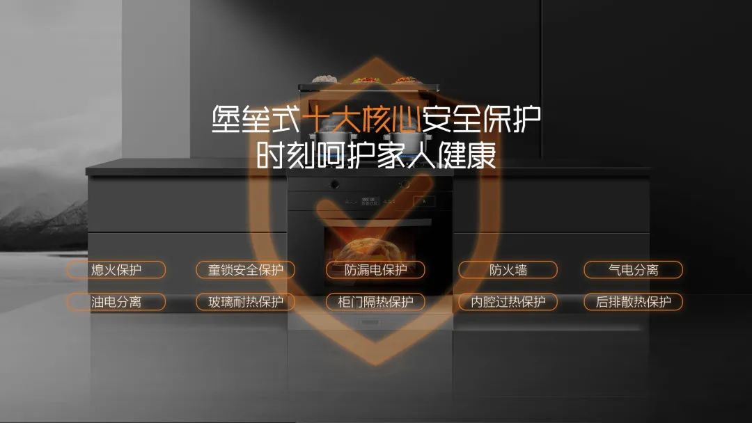 熄火保護(hù)、童鎖安全保護(hù)、防漏電保護(hù)、防火墻、氣電分離、油電分離、玻璃耐熱保護(hù)、柜門隔熱保護(hù)、內(nèi)腔過(guò)熱保護(hù) 、后排散熱保護(hù)。十大安全防護(hù),保障烹飪安全!