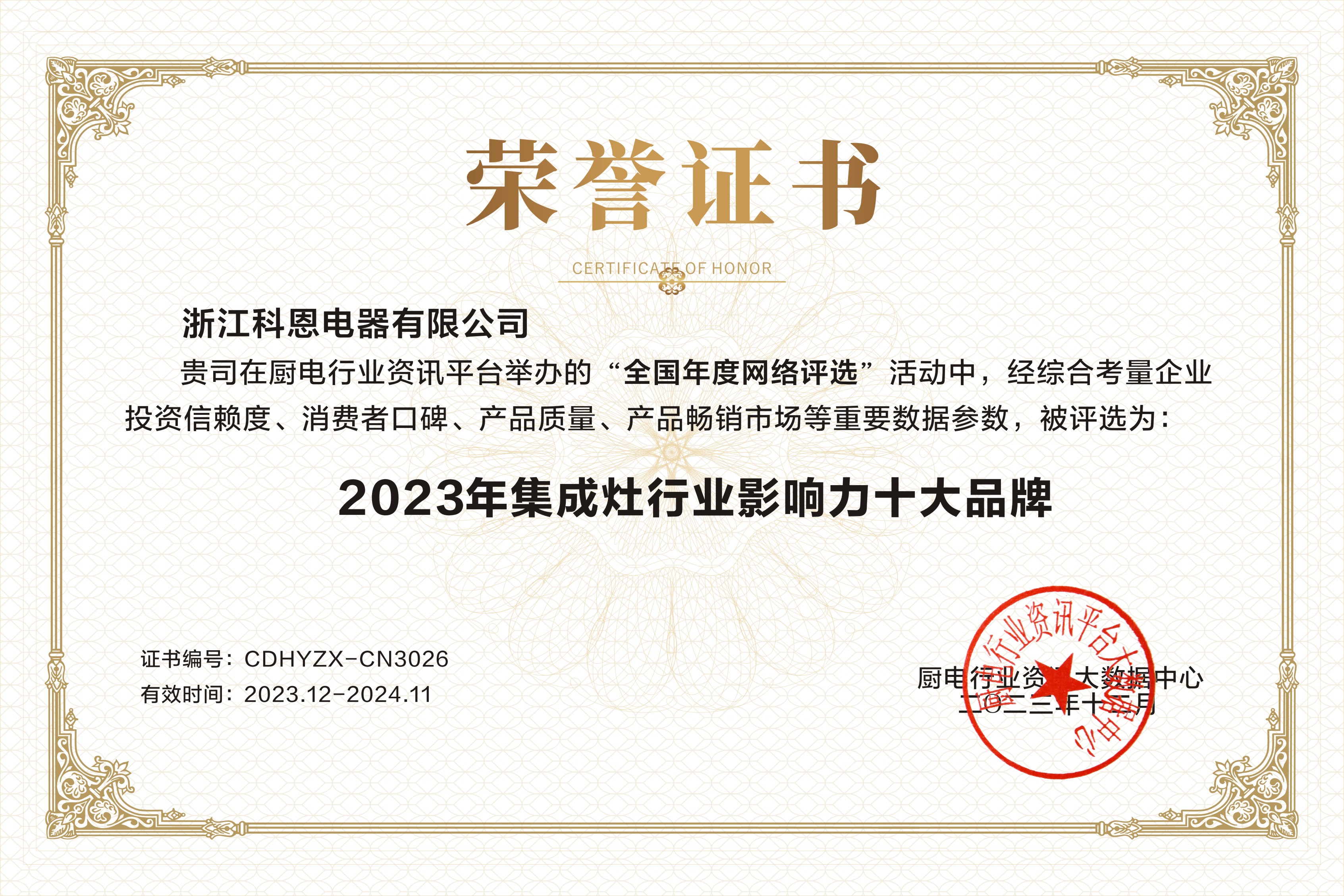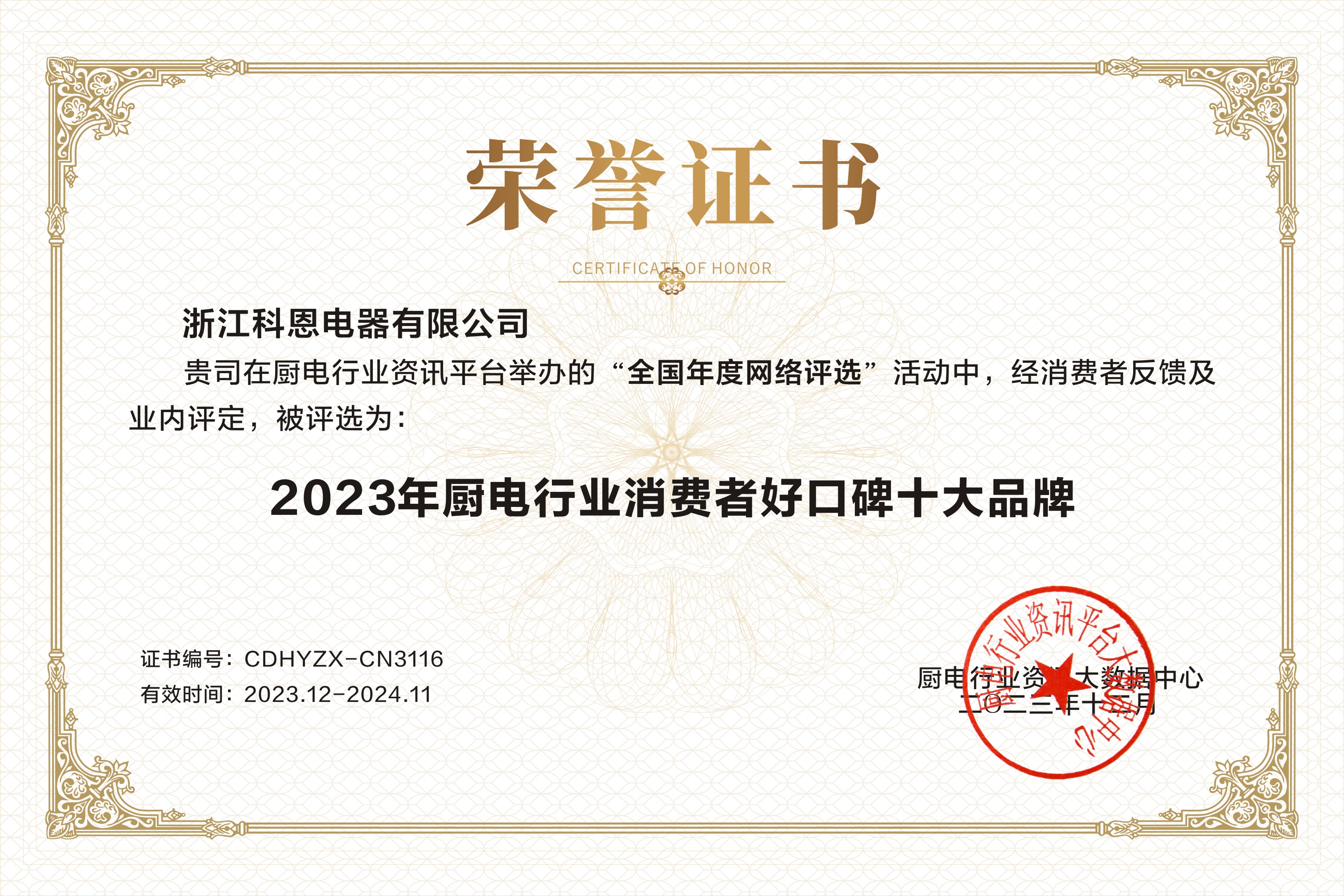匠心“灶”就精品,品質見證實力!2023年,浙江科恩電器有限公司再次憑借實力連獲3獎!