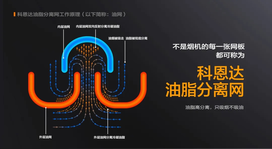 科恩6530免清洗煙機,采用科恩達油脂分離網(wǎng),真正做到油脂分離,廚房無煙。