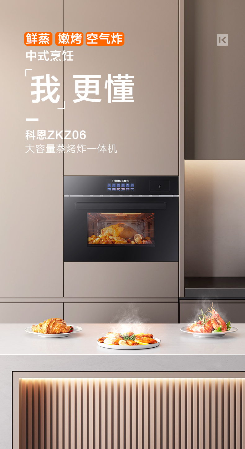 科恩ZKZ06嵌入式蒸烤一體機能夠完美地融合于家居裝飾之中。隱蔽式安裝方式,使得整體廚房布局更為整潔有序,同時,獨特的外觀設計既典雅大方,又具現(xiàn)代感,能為整個家居空間帶來濃厚的藝術(shù)氛圍。