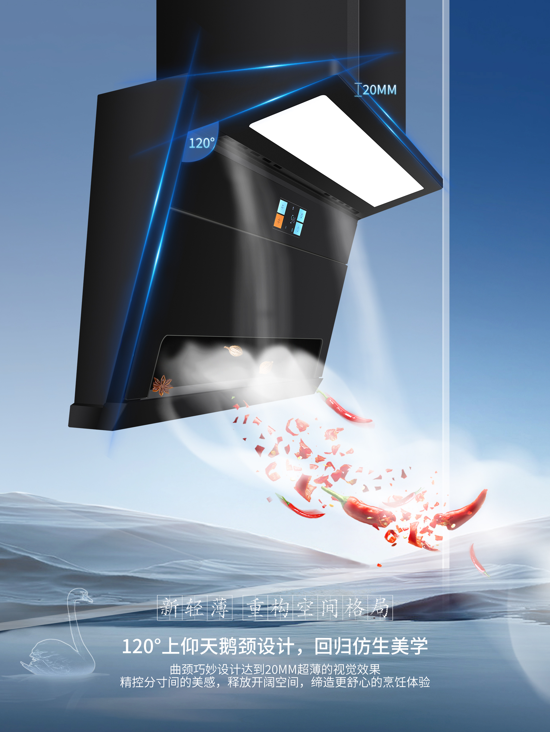 科恩7730智能聯動煙機整機采用特氟龍工藝,一體成型的設計,不僅使其具備不沾油的卓越特性,更在外觀上顯得格外美觀。這種獨特的工藝處理,讓廚房器具在日常使用與清潔過程中都變得輕松便捷,始終保持著光潔如新的狀態,為廚房增添了一份精致與高雅。其新輕薄的設計重構了廚房的空間格局。120°上仰天鵝頸設計堪稱一大亮點,曲頸的巧妙構造營造出2.0cm超薄的視覺效果。在精控分寸之間展現出無與倫比的美感,同時釋放出開闊的空間,讓烹飪者能夠在寬敞舒適的環境中盡情施展廚藝,締造更為舒心愉悅的烹飪體驗。