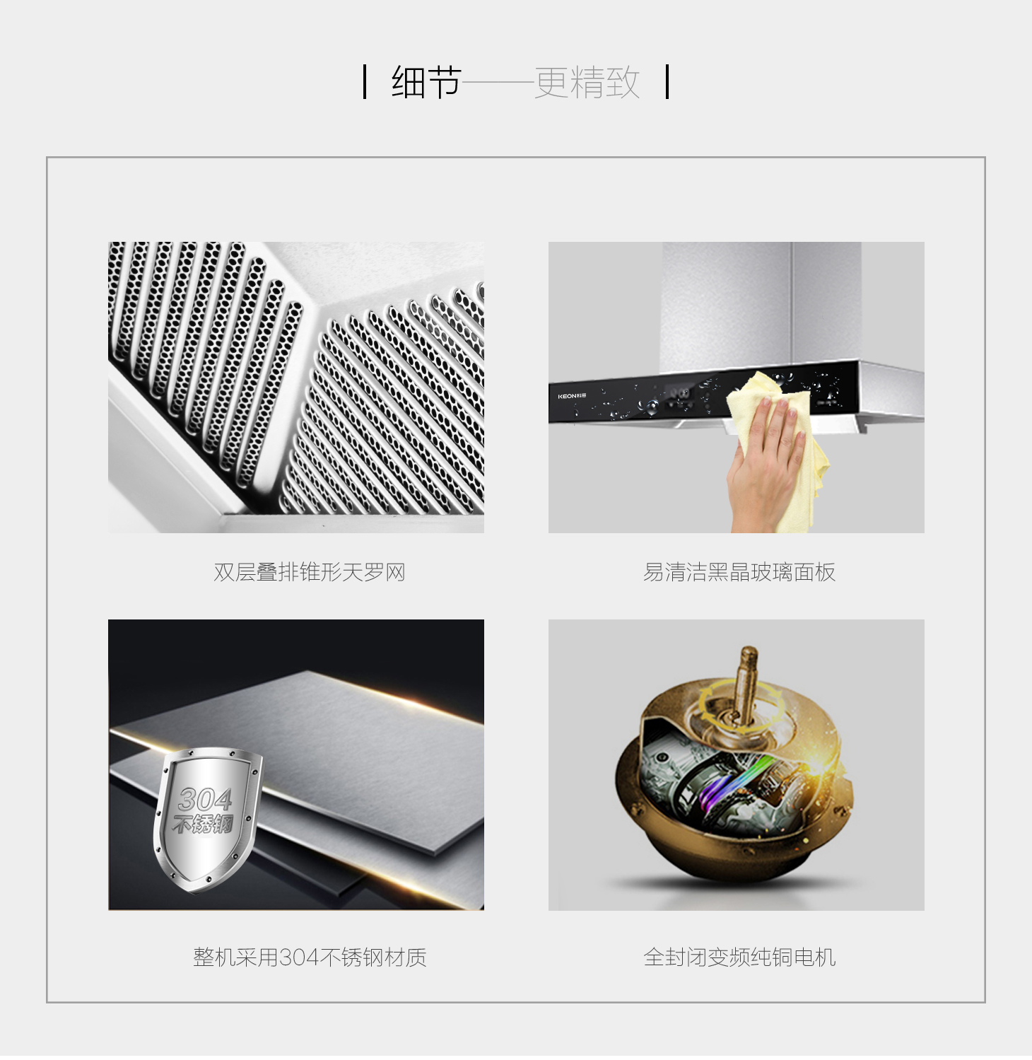 - 雙層疊排錐形凈濾網,導油分離油煙更徹底。