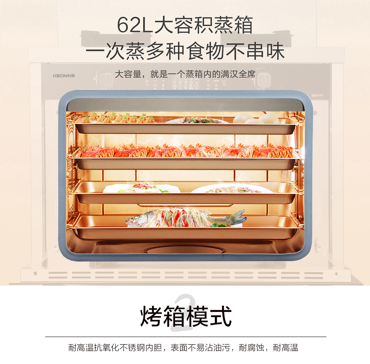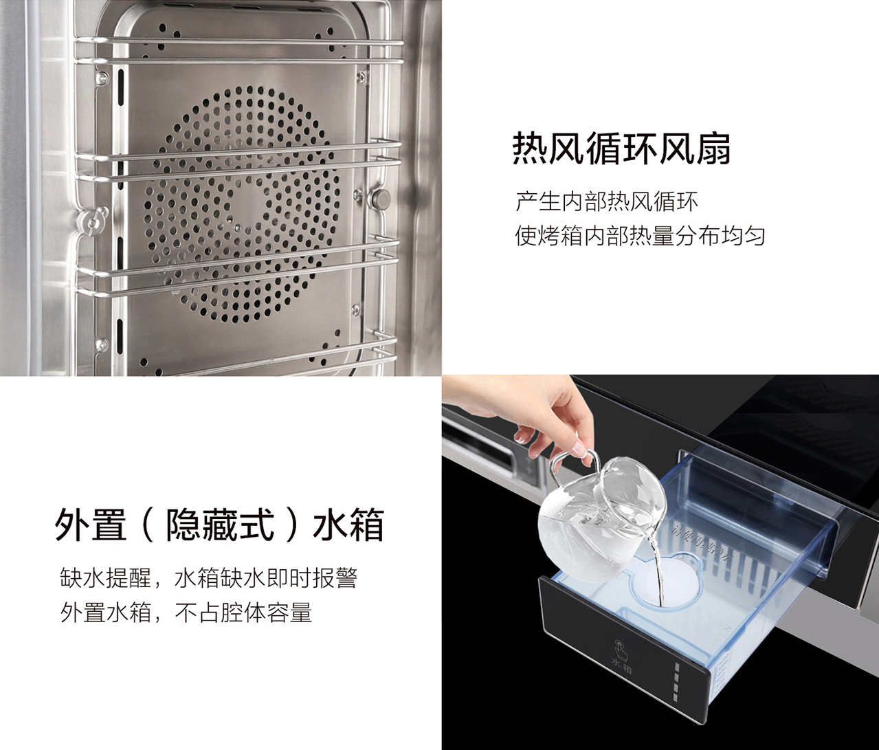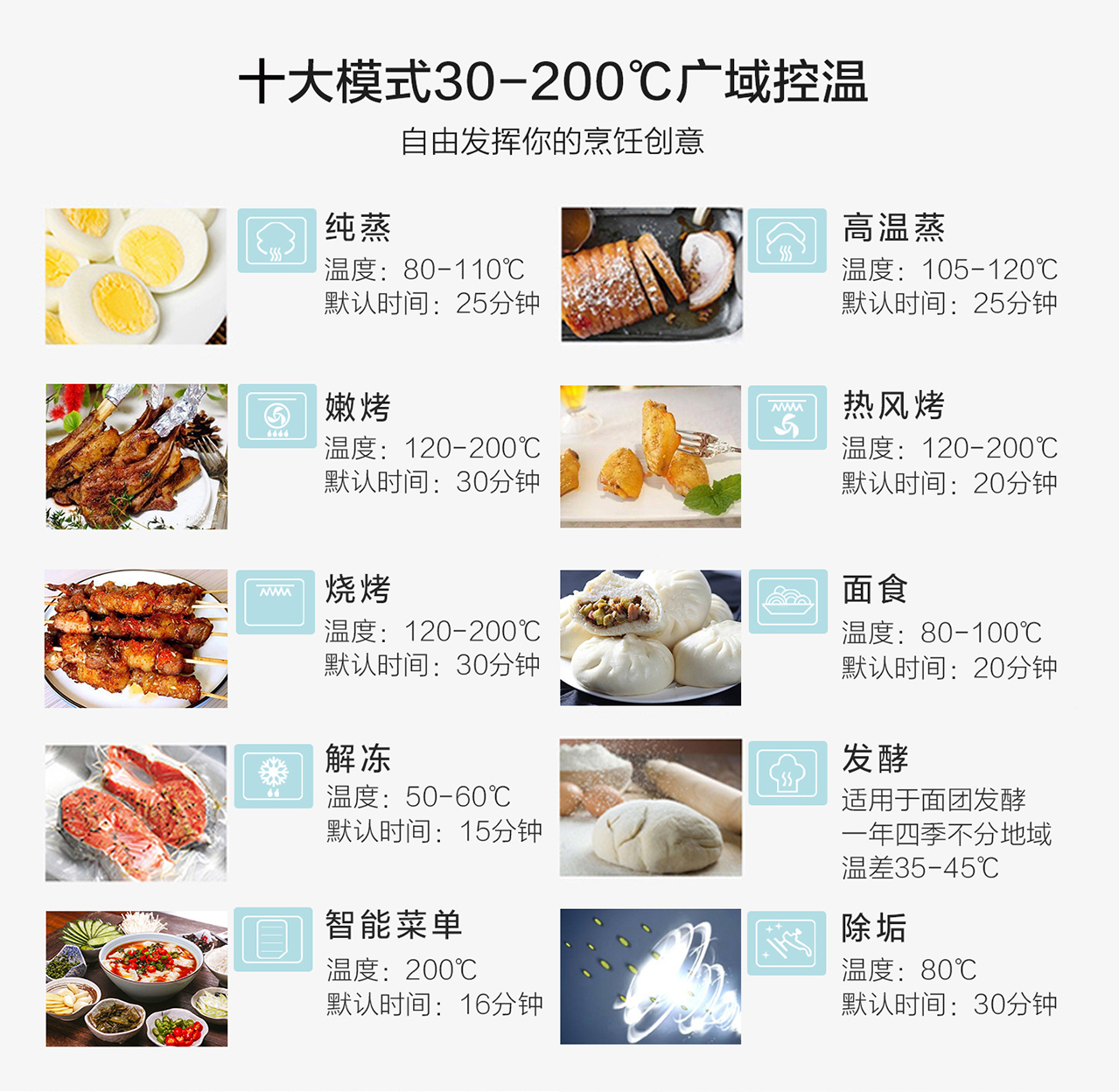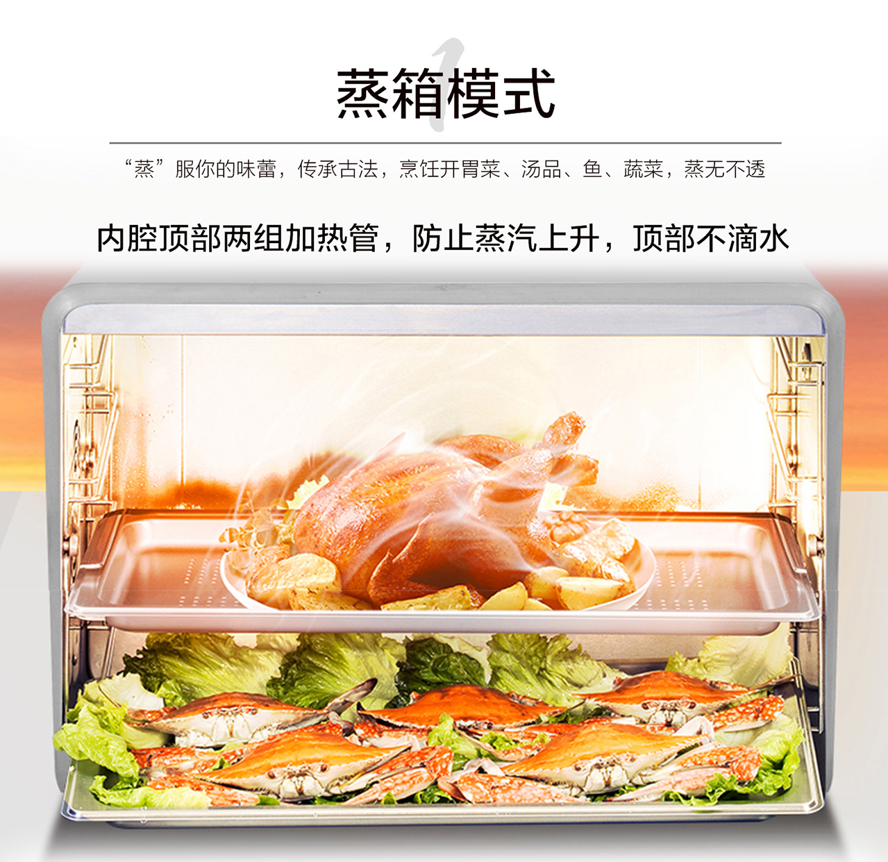 - 62L大容量食品級(jí)304不銹鋼內(nèi)膽,上下4層設(shè)計(jì),9種蒸烤模式。