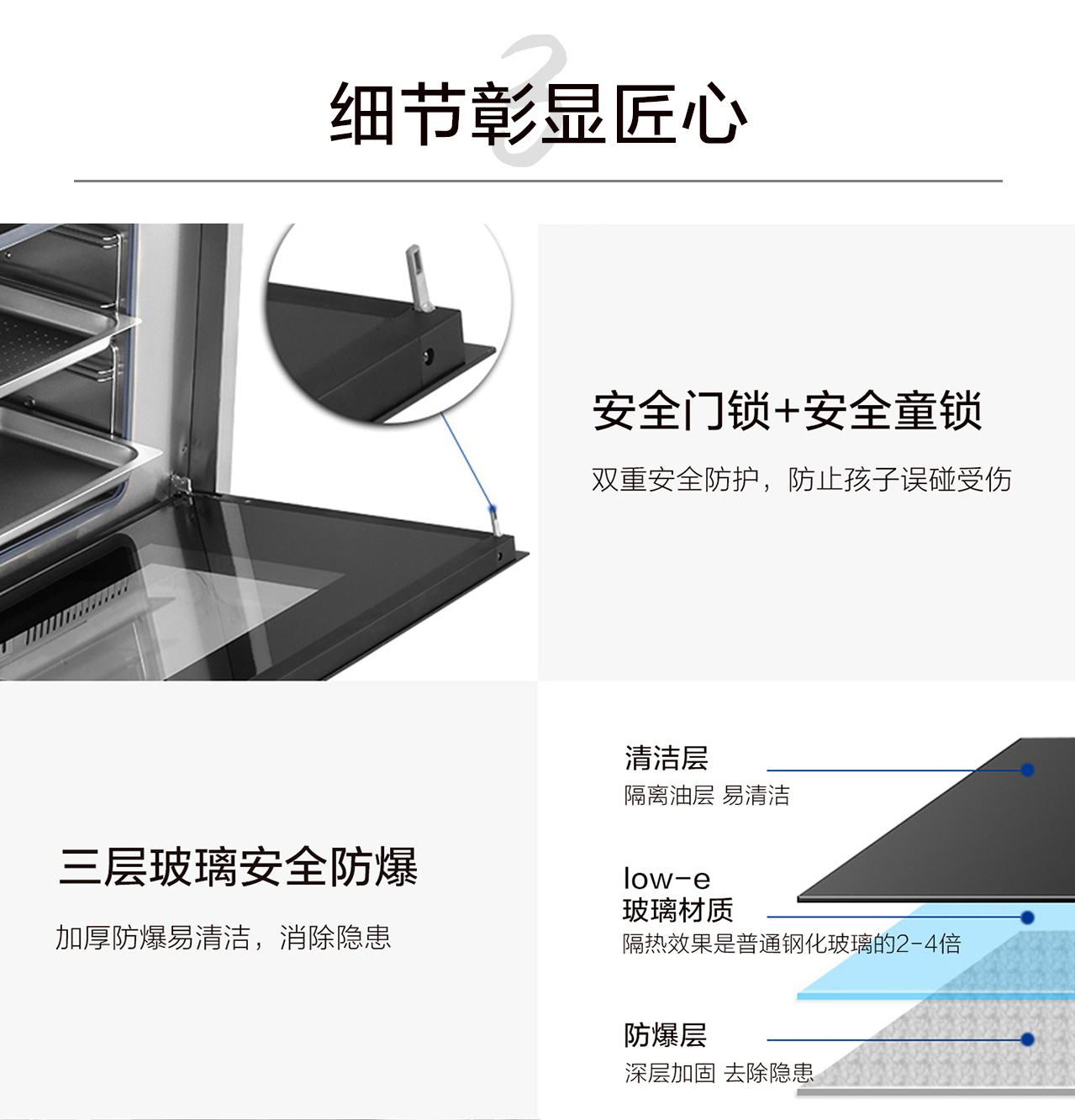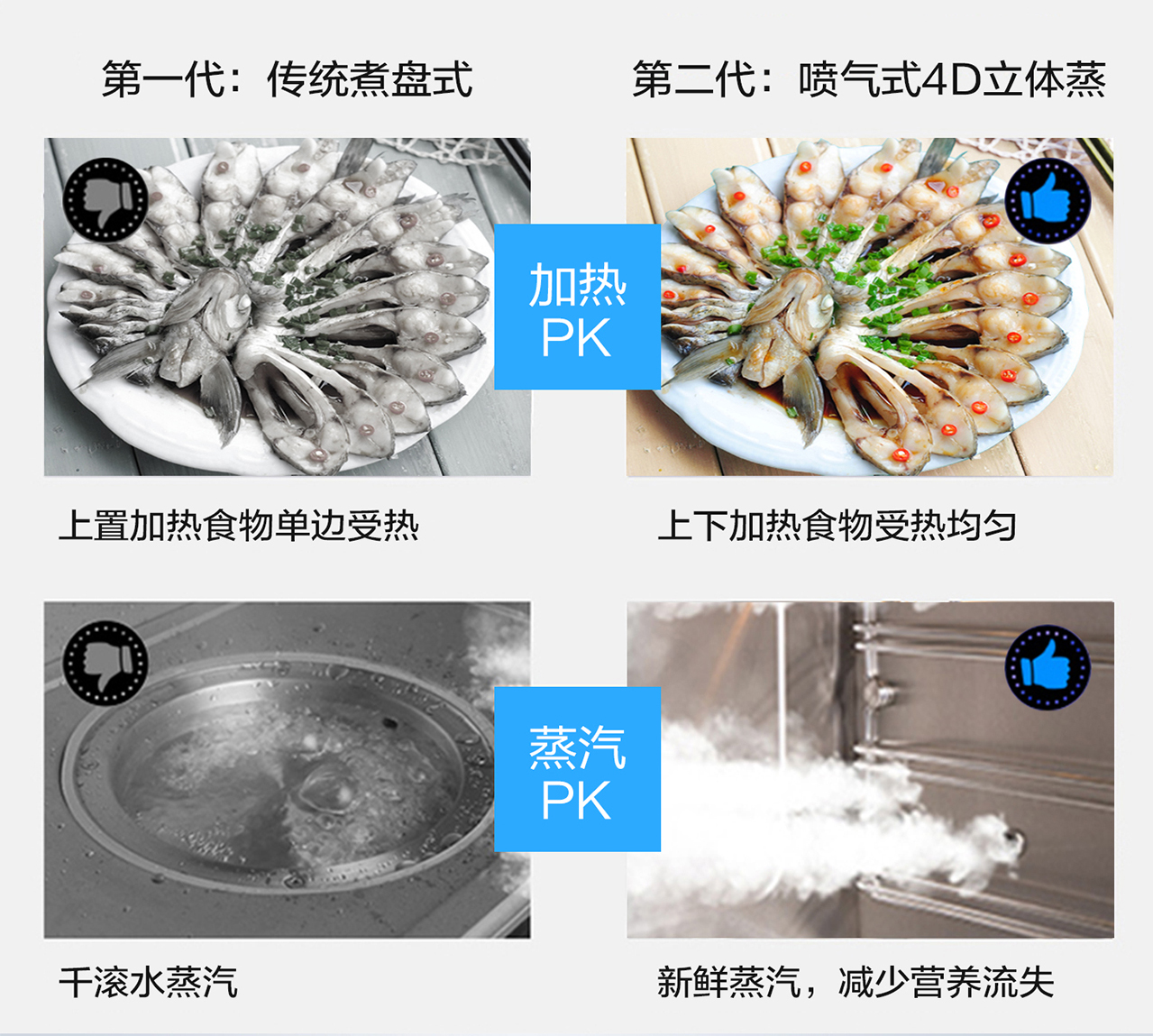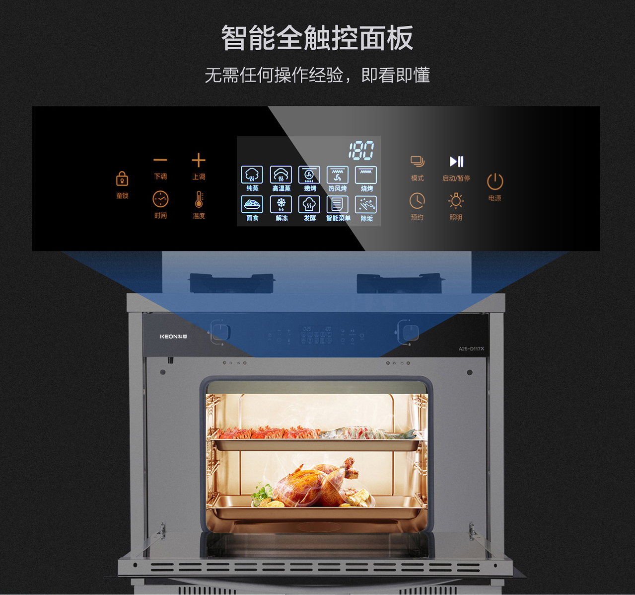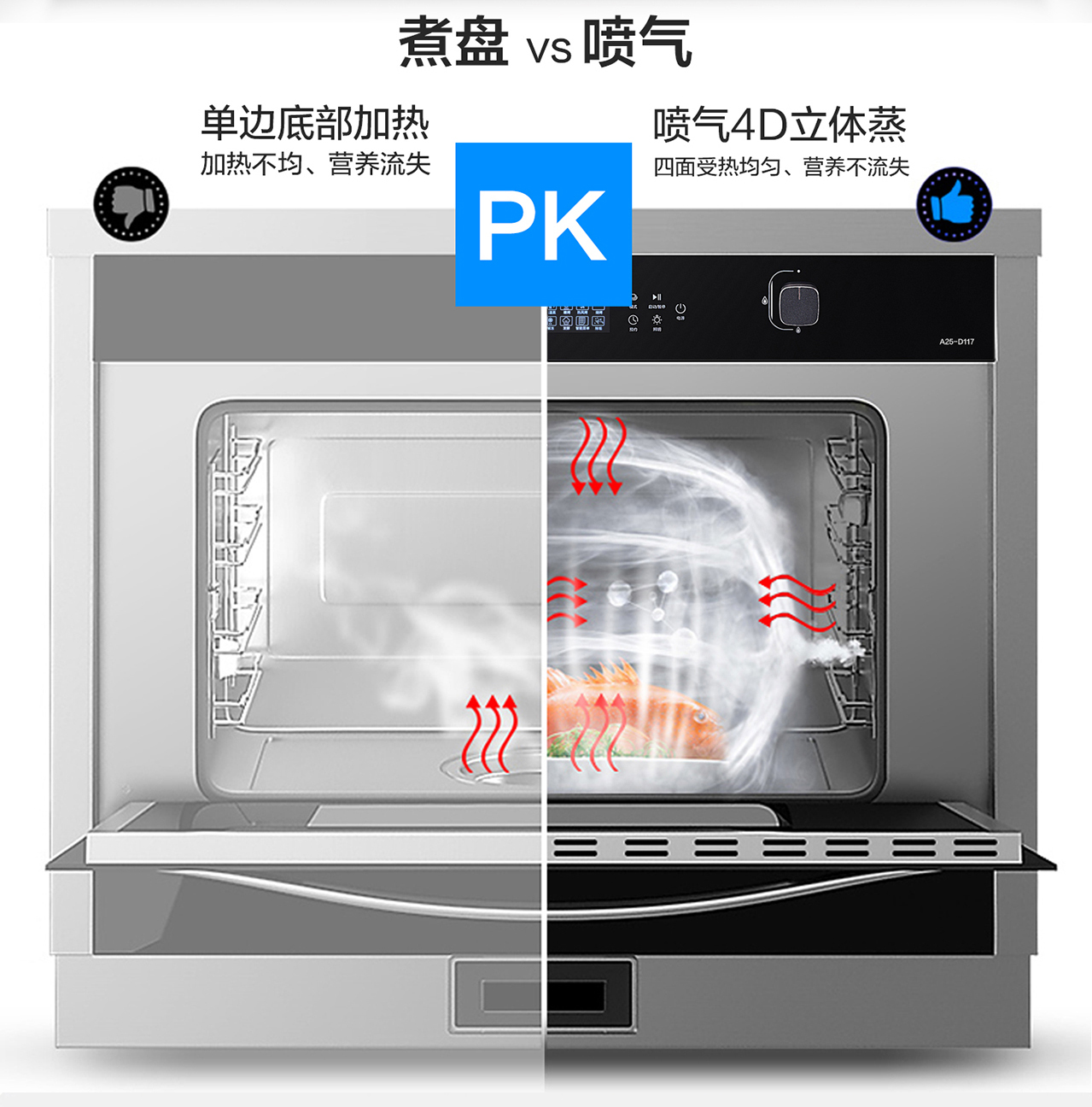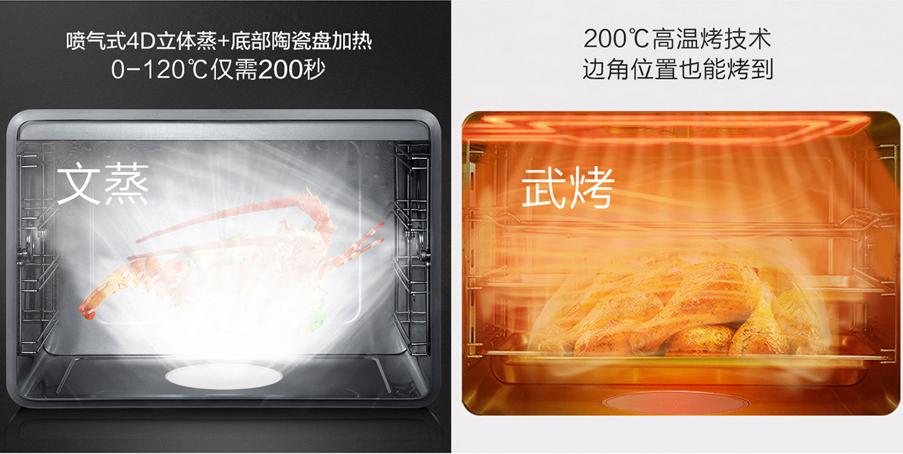- 62L大容量食品級(jí)304不銹鋼內(nèi)膽,上下4層設(shè)計(jì),9種蒸烤模式。
