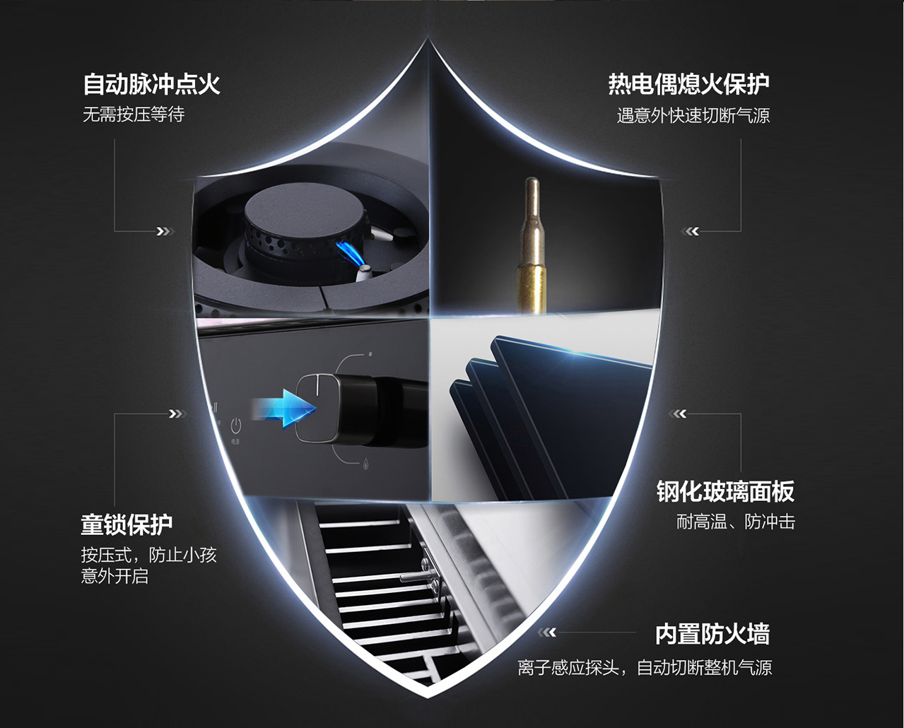 - 8MM加厚黑晶防爆鋼化玻璃灶臺(tái)面板,外觀時(shí)尚,易潔易打理。