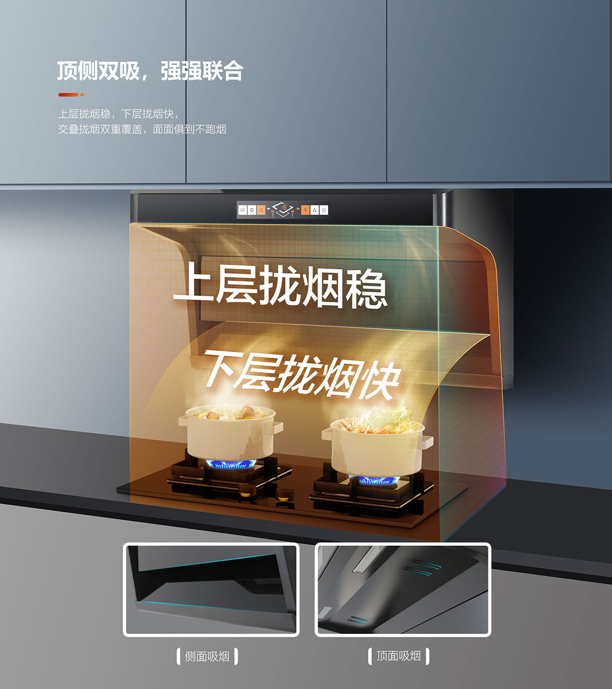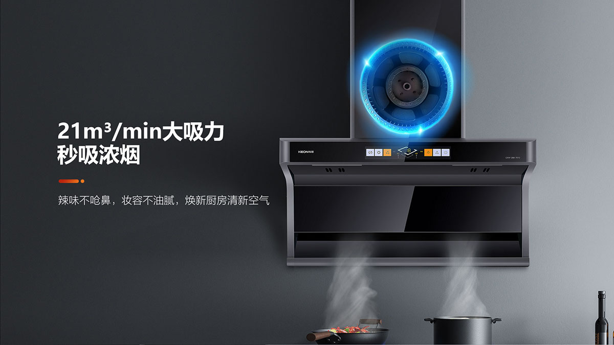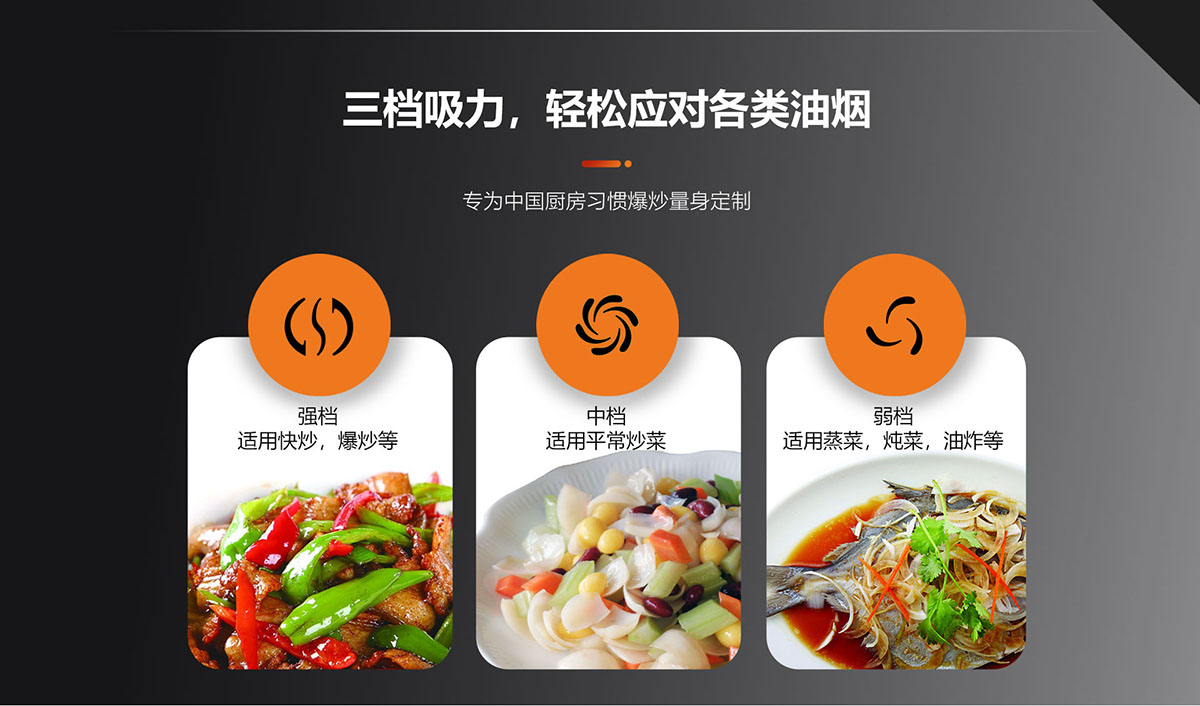 - 三檔吸力,輕松應對各類油煙,專為中國廚房習慣爆炒量身定制