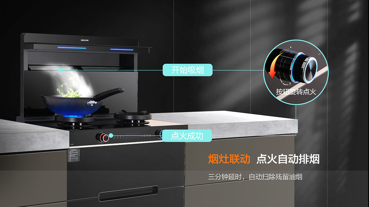 - 煙灶聯動,點火自動排煙,三分鐘延時,自動掃除殘留油煙