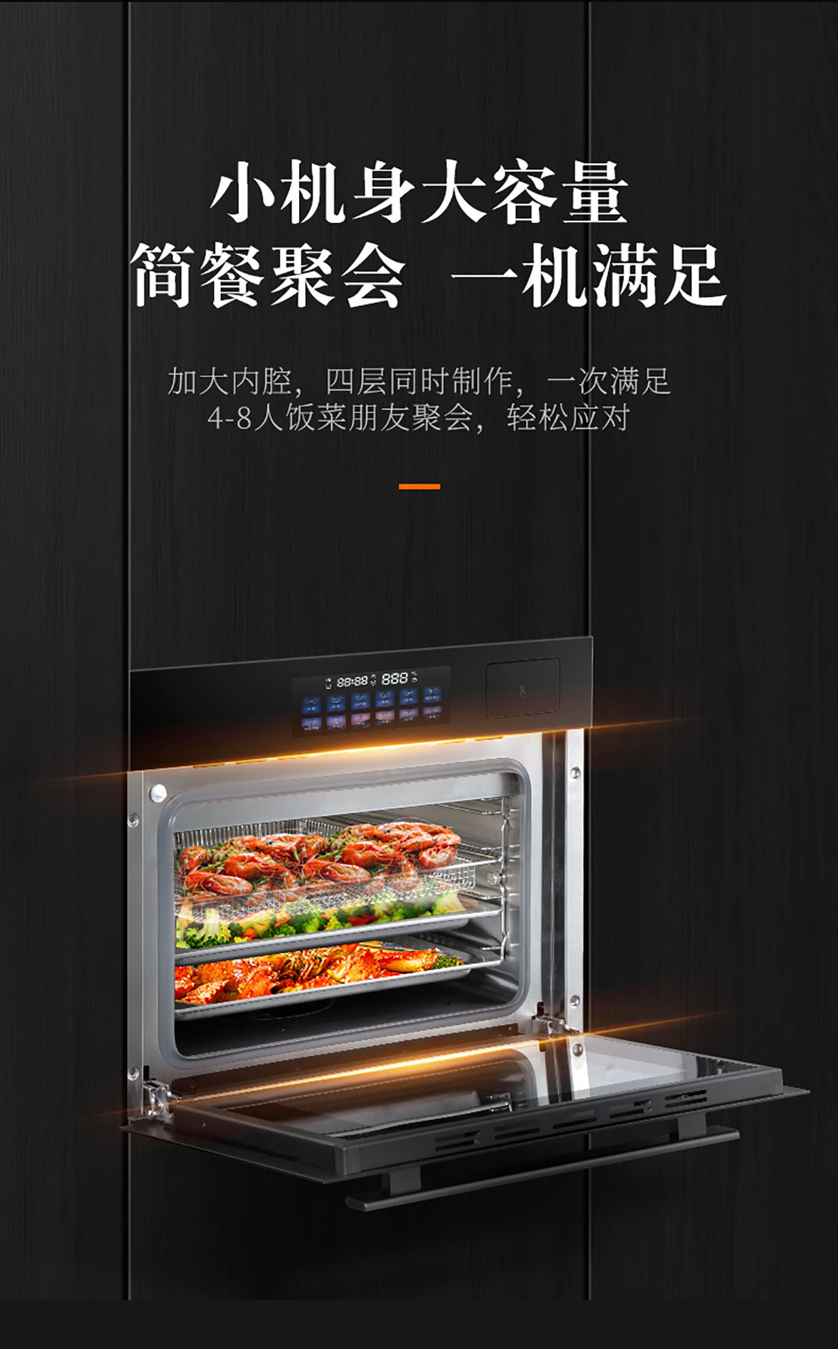 - 50L大容積四層擱架,可滿足多菜同時烹飪