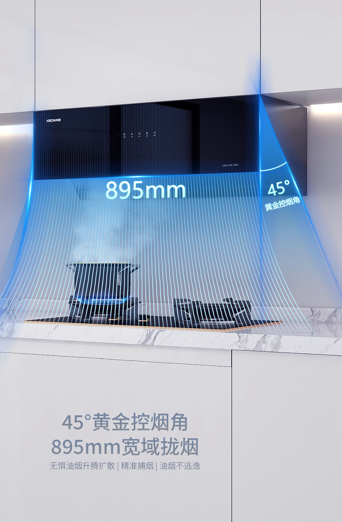 - 智啟式大隔煙屏,黃金控煙角設計,油煙不逃逸