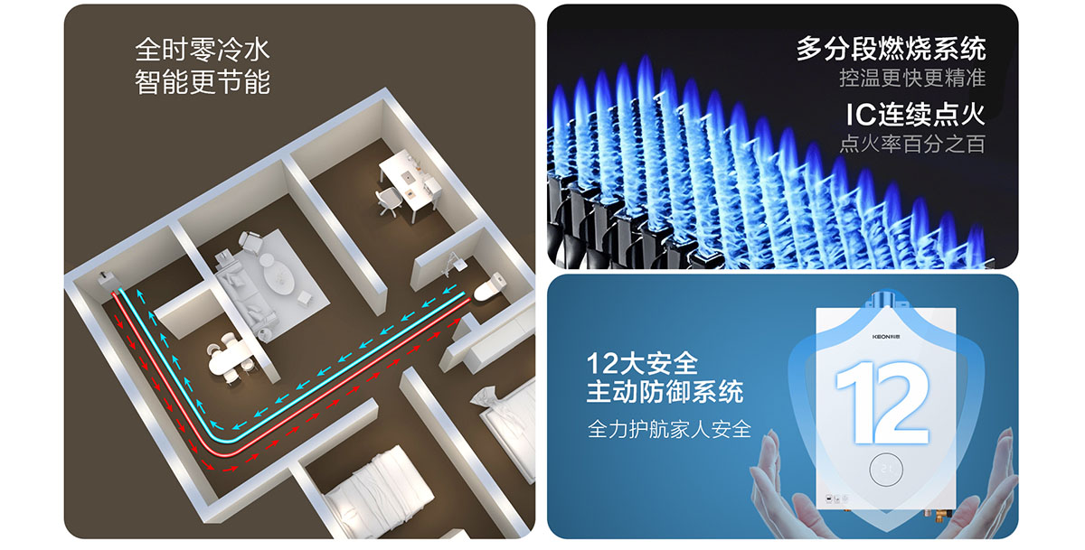 - 采⽤分段燃燒技術,⽔溫調節范圍更廣,速度更快