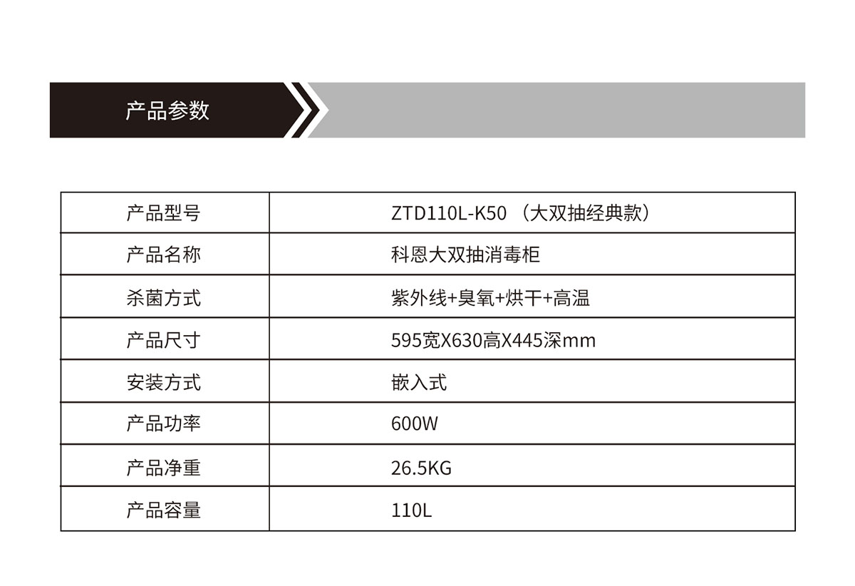產品型號:ZTD110L-K50 (大雙抽經典款)產品名稱:科恩大雙抽消毒柜