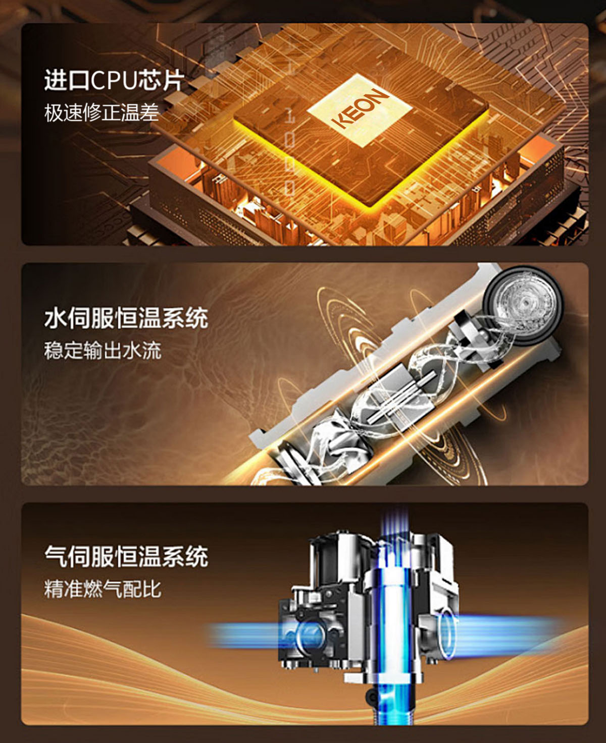 - 極速智能恒溫技術(shù),精確的燃氣比例閥恒溫調(diào)節(jié)系統(tǒng)。