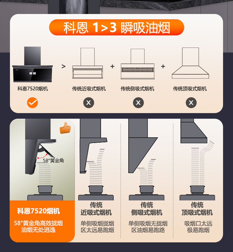 - 采用58°黃金開合角,緊鎖油煙不逃逸