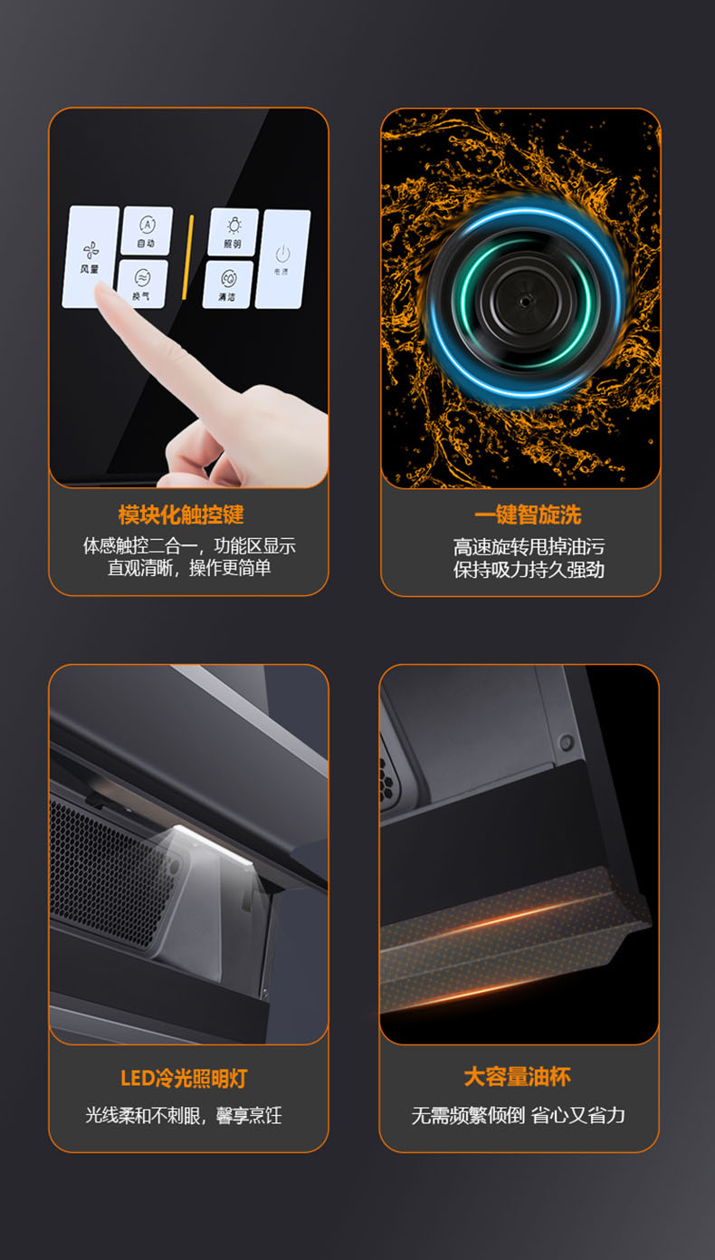 - 28m³/min颶風吸力,爆炒瞬間吸凈油煙